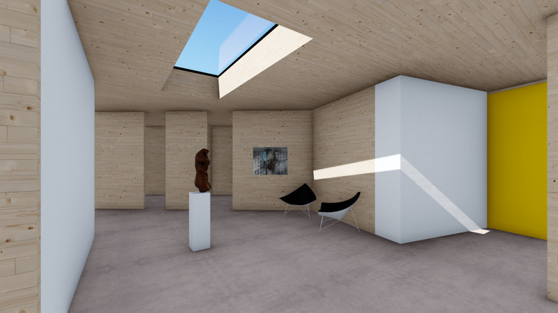 navrženo rozměrné střešní okno 4×1,5m. Z centrální haly