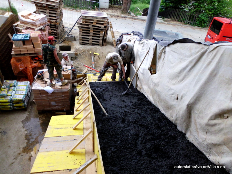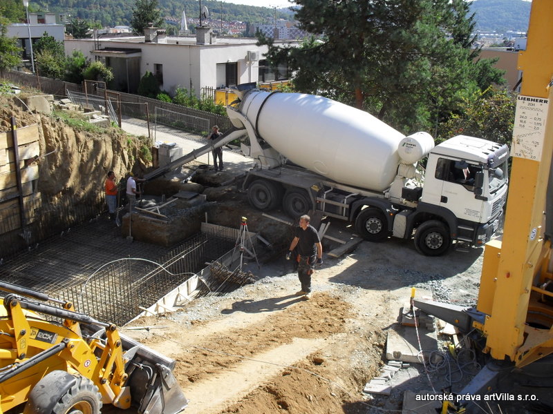 části. Založení domu je na železobetonové bílé vaně jdoucí přes dvě
