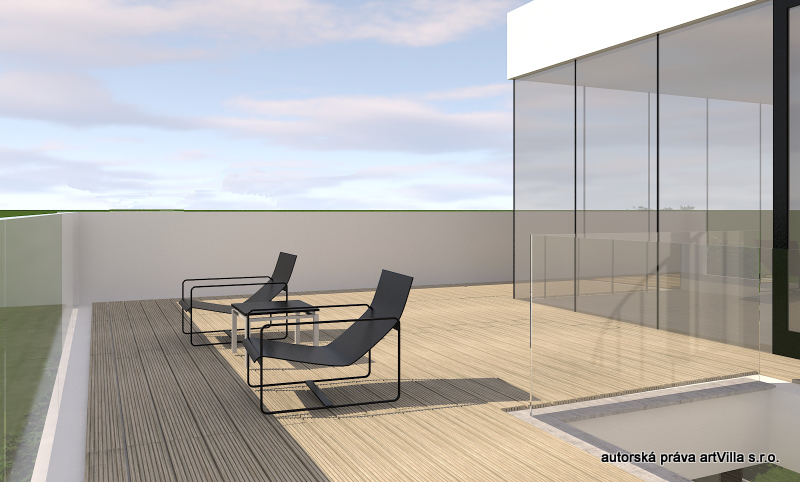 o ploše 40m2 pro letní stravování, pobyt a slunění. Z terasy
