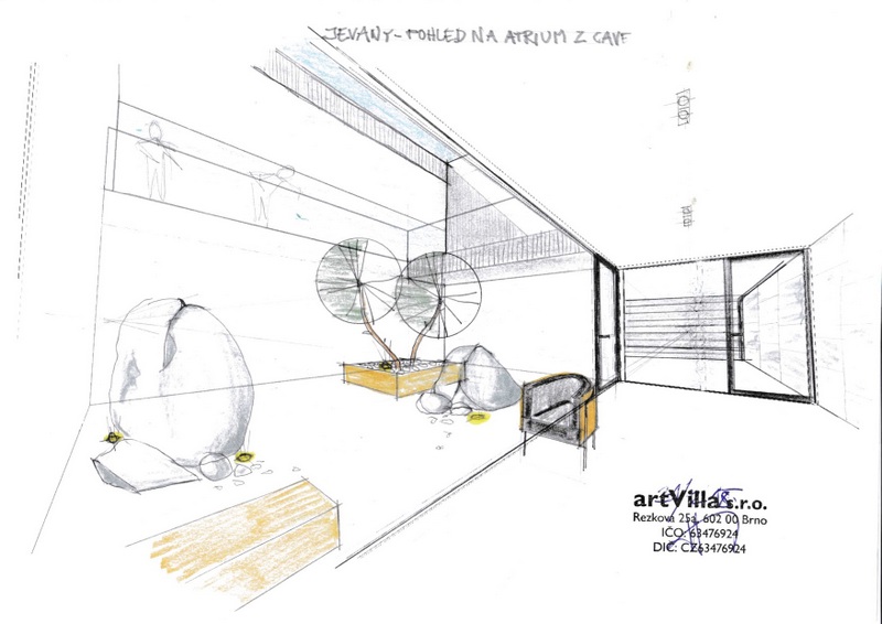 vnitřního atria a na můstku je celoskleněné zábradlí. Prostor pod domem