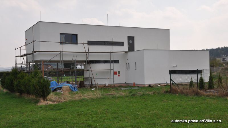 Bílý hranol je od jihu prolomen rozměrnou skleněnou stěnou na celou